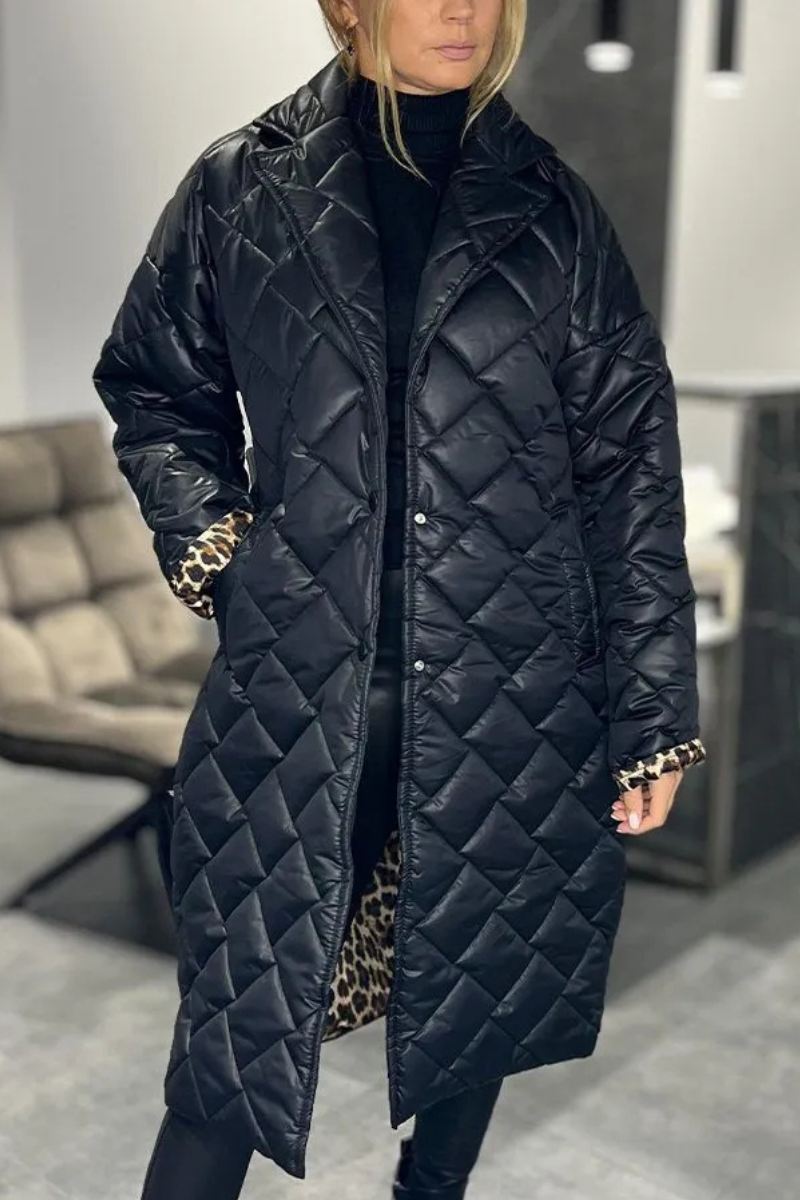 Astrid forener sofistikeret minimalisme med en selvsikker kant. Den vendbare, quiltede frakke giver dig to udtryk i ét – et elegant, klassisk ydre og en leopardforet inderside, der tilfører personlighed og varme til kølige dage.